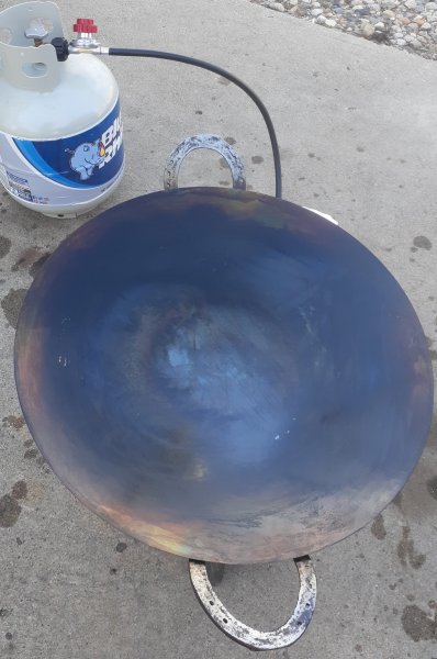 Pulled the trigger on a Hillbilly Wok build. Had a couple old horse shoes laying around and had a friend weld them on and plug the arbor hole. Then took a grinder wheel after it, then as 36 grit flap disc, and next a 60 grit flap disc. Washed it good with soap and water. Then started the seasoning process on my fish fryer base by getting it warm and getting a blue oxide treatment on it then after that hit it with light coats of cooking oil and let it smoke and carbonize then hit it with another coat a few times. Looking forward to cooking in it soon. Wish I'd have thought to take pics through the whole process, but here are a few of the end product. Ignore the oil drips on the driveway from the seasoning process. ;) The light reflecting really shined on the pic of the bottom, the top is the same but just bad lighting. 20210417_172029~2.jpg 20210417_172122.jpg