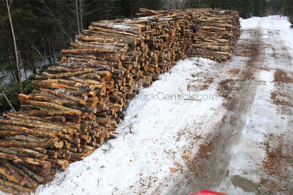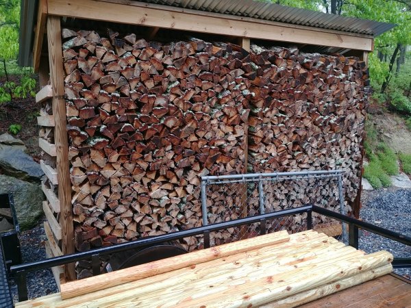 15 cord done... 115 more to go. Mostly sugar maple and yellow/white birch. Firewood for sale to the left, 32x48 pallet, stacked 36" high, 16" long, crates are 1/4 cord each. We build the pallets and crate from slabs off the sawmill. The lone crate to the back right is a 1/2 cord of odds and ends left off each log. The two crates to the far right side of the image is 'camp wood'. When we split the firewood, we split away the low grade/rot from the firewood and put it aside to sell for camp firewood. This is our current setup.