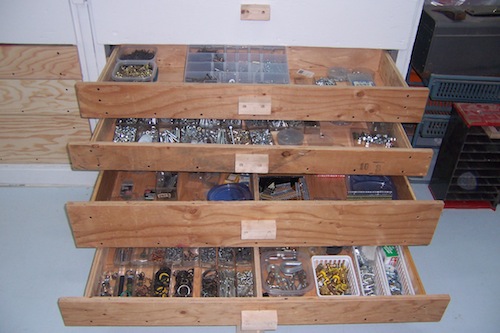 Small drawer on left made from Cherry scraps/salvaged old Oak drawer pull added later,same with the large one made from stained Red Oak plywood from a downtown hospital remodel.Not real fancy but bench is mega stout (300 lbs empty),very stable & top is smooth/ flat. Bolted to 80+ yr old concrete floor with 1/2" wedge anchors using 1/4" x 2 x 2 structural angle as the floor to bench mounting clips.