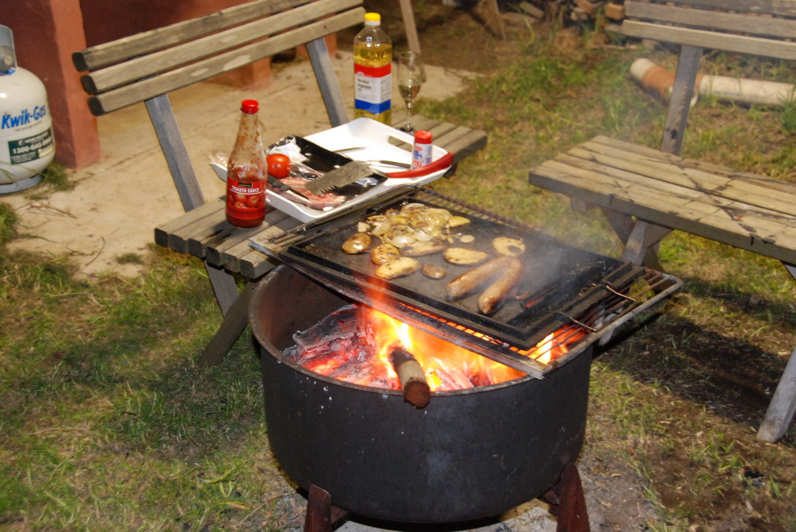 Primitive cooking outside. Lots of ash, smoke and debris in the food but oh so good after a hard days work. Tomato sauce (Ketchup?) essential supply!!!